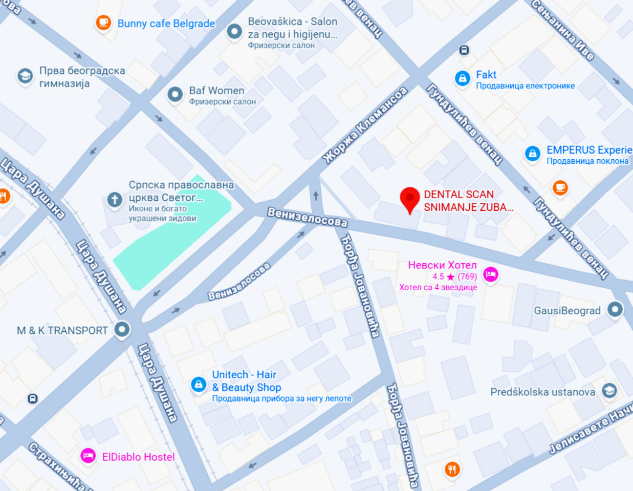 Snimanje zuba Beograd centar, Venizelosova 3, lokacija odlično povezana sa svim delovima Beograda. Bilo da dolazite pešice iz pravca Skupštine, Trga Republike, Kalemegdana ili koristite sopstveni prevoz naša lokacija je lako dostupna. Pogledajte lokaciju za snimanje zuba Beograd centar na googl maps.